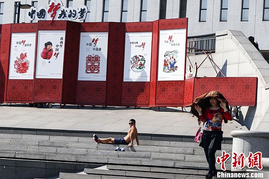 5月12日,一名男子在北京西单文化广场赤膊晒太阳。11日,北京曾下起一场雨,最低气温只有8℃,而12日却来个了急转弯,最高气温上升到29℃。中新社发 张浩 摄