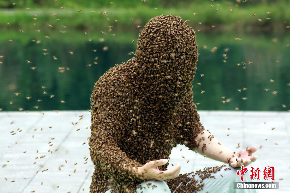 图为江西“第一蜂人”阮良明静坐挑战,上身已布满密密麻麻的蜜蜂。邹海斌 摄