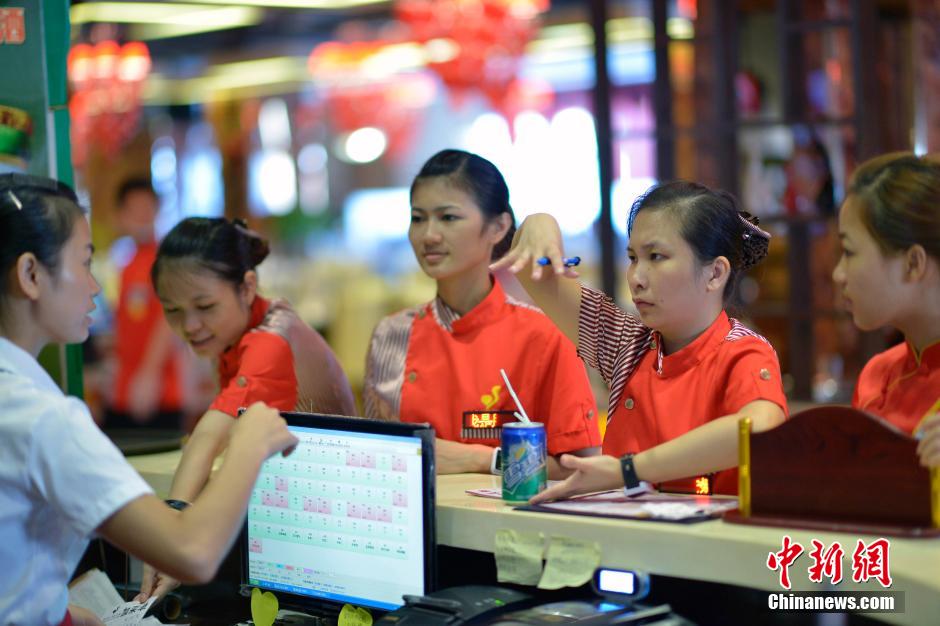 5月19日,记者走进在椰城海甸五西路边的重庆刘一手心火锅海口店,探访这家名为“无声餐厅”。说它无声,并非真是“无声无息”,而是因为餐厅目前员工80名员工中,52名是聋哑人,年龄在18岁至35岁之间,所有员工都从海南招聘,经过45天统一培训后上岗。他们以笑容弥补了语言缺失,也带给顾客不同的火锅体验。图为三位餐厅工作人员用手语沟通交流。中新社发 骆云飞 摄