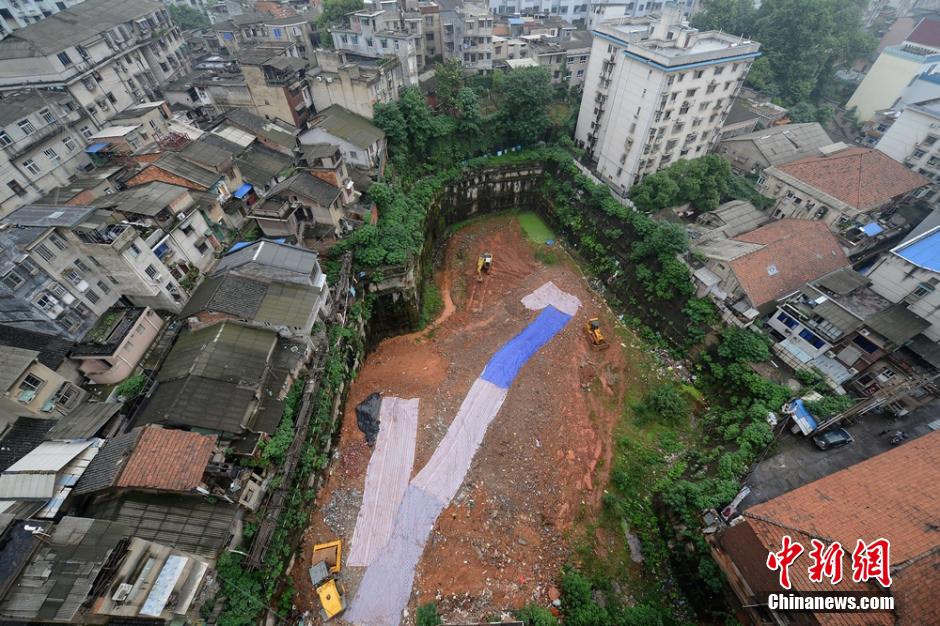 5月22日,长沙市劳动广场附近的“天坑”。据了解,该“天坑”原为澳洲商业广场,天心区重点开发项目工程,2009年开始施工,2010年6月完成基坑开挖后再无动作,如今已形成一个约2000平方米的闲置“天坑”。4年里,基坑内壁长出青草,地基出现下沉,周边20余户居民房出现裂缝。天心区城乡建设局安全科科长杨龙表示,“天坑”已回填了3000多立方米的土,共预计需要回填12000立方米的黄土。 图为“天坑”周边耸立着高矮不一的楼房。杨华峰 摄