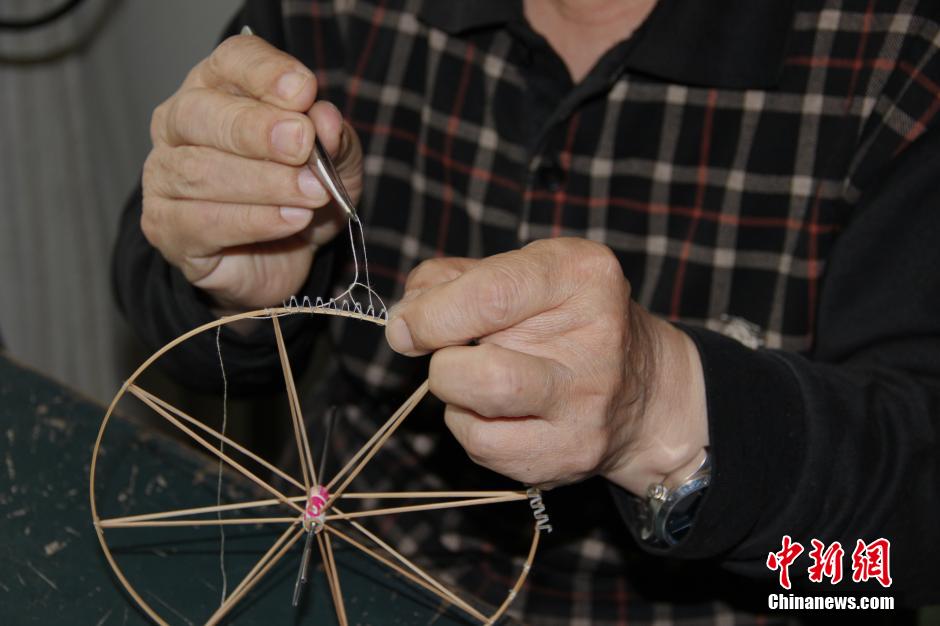 现年77岁的张天伟老人是陕西省非物质文化遗产项目张氏风筝制作技艺代表性传承人,以制作动态风筝闻名。所谓动态风筝,就是在传统风筝的基础上增加风力机械传动装置,以自然风为动力,经齿轮等巧妙机构带动风筝上某些部位变化活动。图为手工制作风筝。阿琳娜 摄