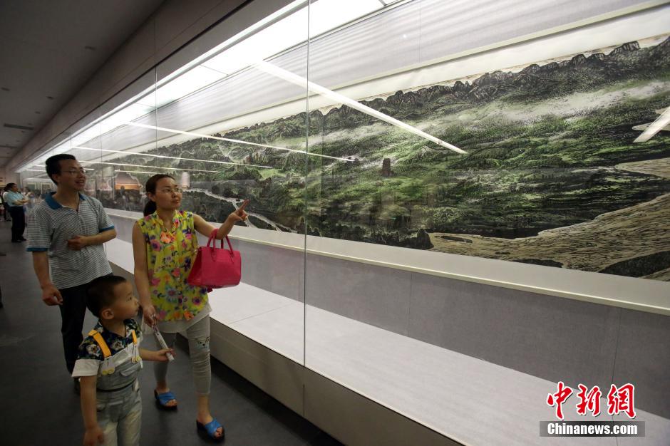 5月24日,由30多位山西版画家历时3年创作制成的巨型版画《汾河千里图》首次在山西亮相。该版画长36.26米、宽1.22米,是中国国内已知的独立题材尺幅最大的版画。版画展示了山西母亲河汾河由源头到入黄河,以汾河为中轴线,将三晋大地的自然风光与人文胜览收入画作,该作品将成为太原美术馆的镇馆之宝永久收藏。当日,《汾河千里图》捐赠仪式暨侯琪版画展”在太原美术馆隆重开幕。图为市民在欣赏《汾河千里图》。中新社发 张云 摄