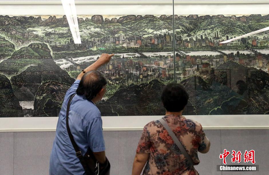 5月24日,由30多位山西版画家历时3年创作制成的巨型版画《汾河千里图》首次在山西亮相。该版画长36.26米、宽1.22米,是中国国内已知的独立题材尺幅最大的版画。版画展示了山西母亲河汾河由源头到入黄河,以汾河为中轴线,将三晋大地的自然风光与人文胜览收入画作,该作品将成为太原美术馆的镇馆之宝永久收藏。当日,《汾河千里图》捐赠仪式暨侯琪版画展”在太原美术馆隆重开幕。图为市民在欣赏《汾河千里图》。中新社发 张云 摄