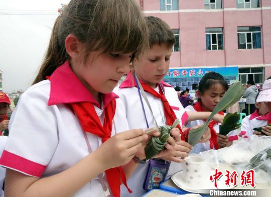 5月29日,来自瑞士的小朋友鞠乐轩(左)和哥哥鞠乐恒一起包粽子。当天,西宁市劳动路小学和前营街小学共同举行“庆六一粽叶飘香”校园主题活动,学生们进行了古诗词大赛,并和家长一起动手包粽子。中新社发 赵凛松 摄