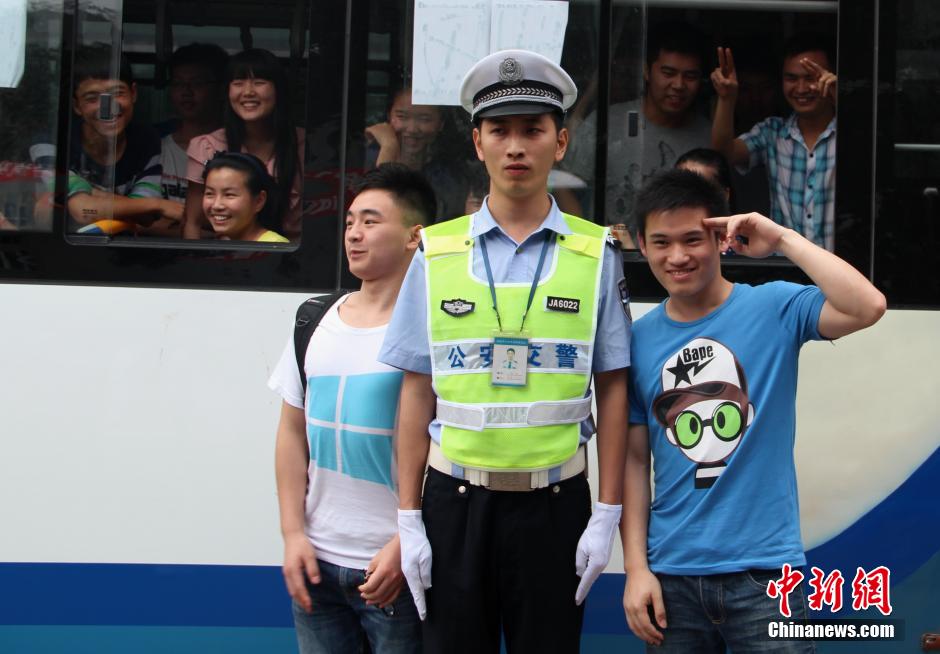 6月7日,宜宾“帅交警”吸引参加高考的女生合影。当日,四川宜宾一中考点外,一名正在路边执勤的交警吸引了走出考场的考生们,因帅气的形象,挺直的身躯,标准的指挥手势,引许多男女生围观和拍照合影。据悉,这位吸引考生注意的交警叫刘毅,系宜宾交警一大队执勤人员。中新社发 李桢 摄