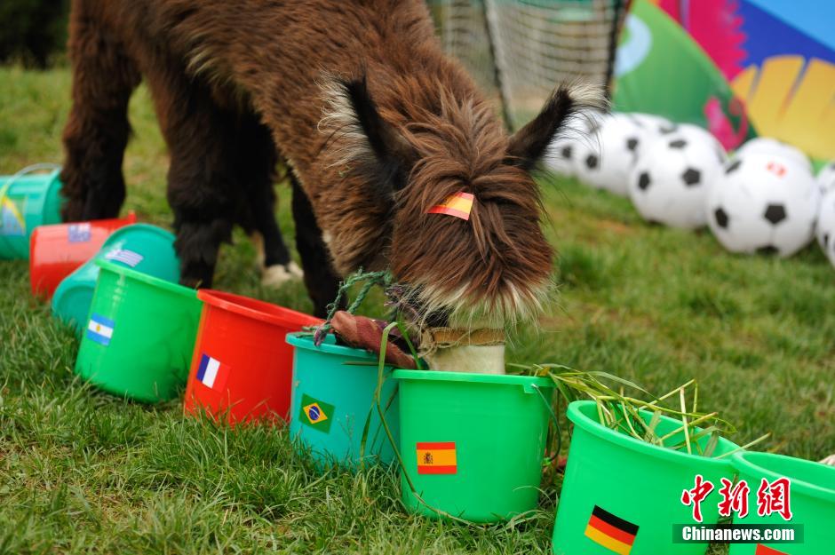 6月10日,动物园的羊驼看好西班牙夺冠前景。当日,云南野生动物园举行别开生面的动物预测世界杯活动,小狮子、羊驼、鹦鹉等动物纷纷变身“预测帝”。中新社发 刘冉阳 摄