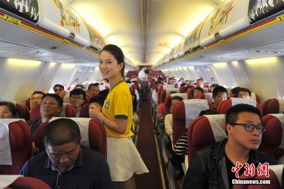 6月13日,云南一航空公司一航班上,空姐穿着巴西队服为旅客服务。2014年巴西世界杯正式拉开帷幕。据了解,世界杯期间,该航空公司将在所有航班上开展“世界杯足球赛”机上特色服务活动。任东 摄