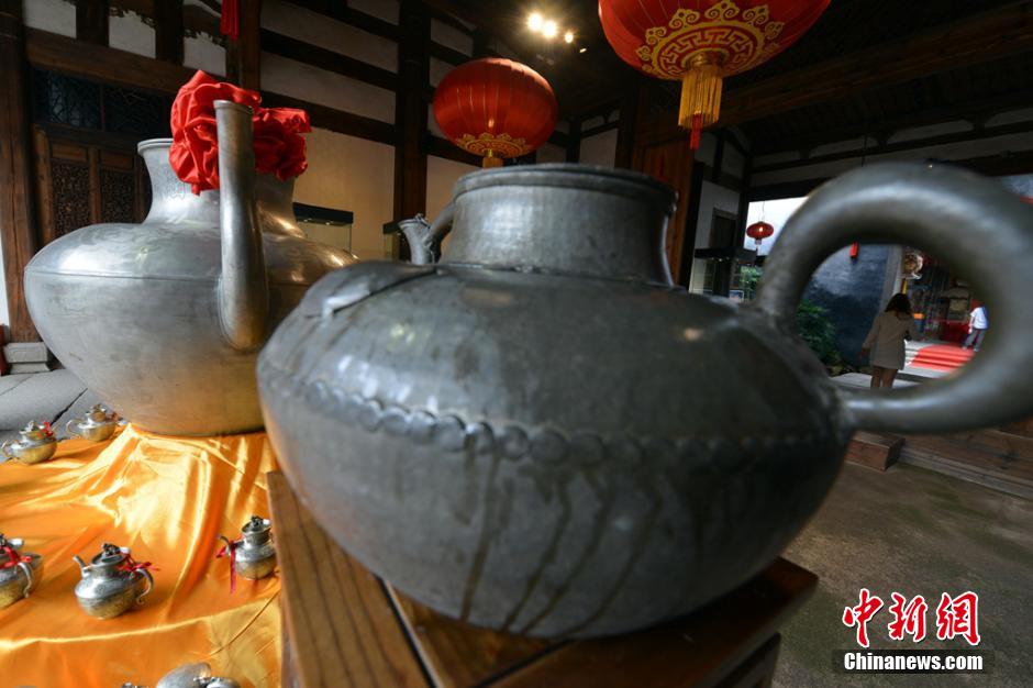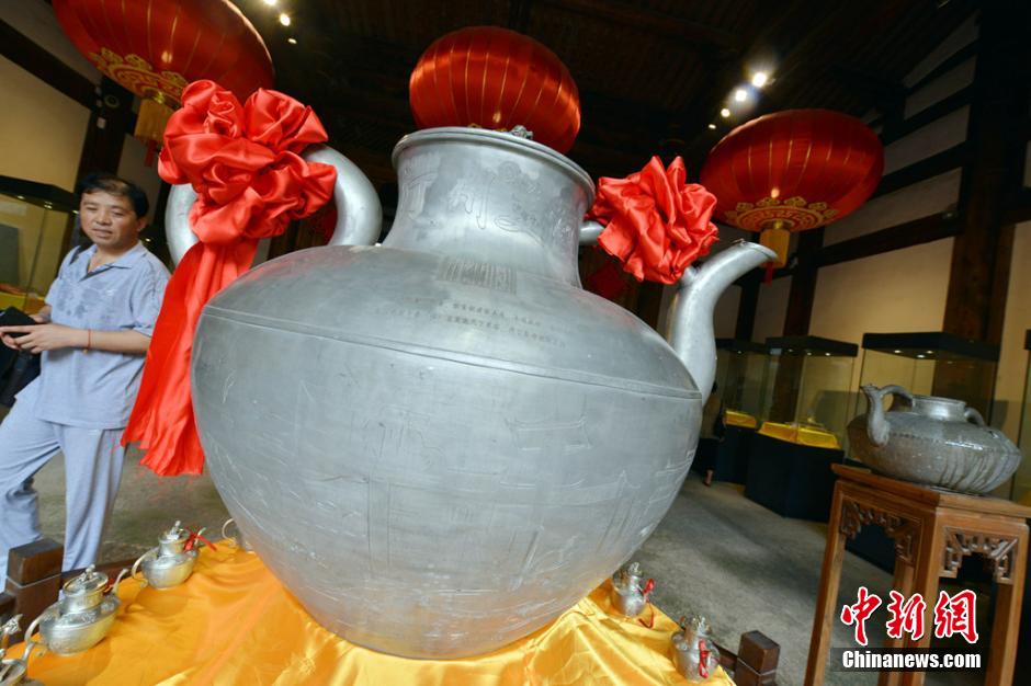 6月18日,一个可装下559斤汀州米酒以龙岩传统锡壶工艺制作的大锡壶在福州三坊七巷展示。据了解,闽西锡器自古以来经常进贡皇宫,也是客家嫁女儿必备的嫁妆,打锡工艺在龙岩已经传承500多年。张斌 摄