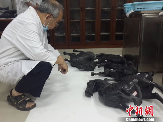 图为6月23日,文物修复人员对西汉木胎漆马进行实验性修复,拼对残缺件。中新社发 曾云 摄