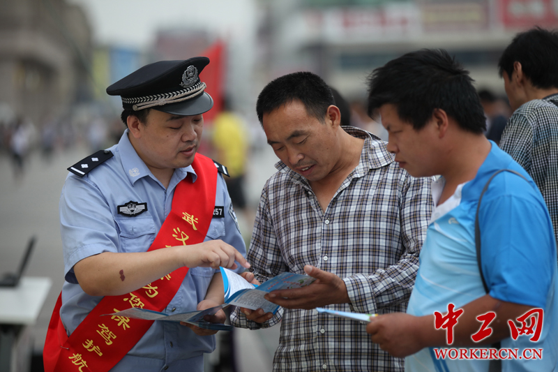 6月25日上午,武汉铁路公安处联合武汉铁路运输中级法院、武汉铁路运输法院,在汉口火车站广场举行了以“珍爱生命、远离毒品”为主题的“6.26”国际禁毒日禁毒宣传教育活动。图为民警向旅客群众讲解禁毒宣传材料。中工网通讯员冯畅 牛振江摄