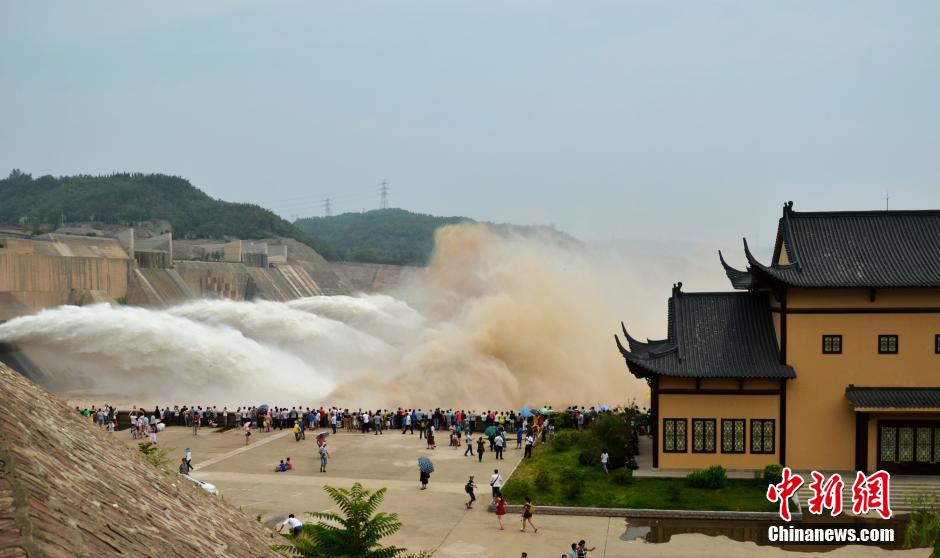 6月30日,2014黄河小浪底调水调沙开始。巨浪翻滚、飞瀑冲天的壮丽景观吸引了全国各地的游人。中新社发 平白 摄