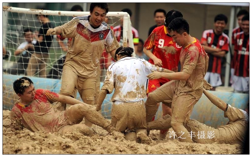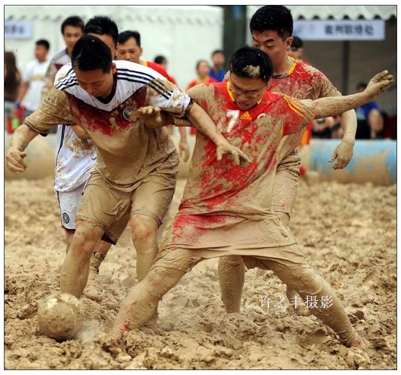 2014年6月29日下午,为期9天的2014泥浆足球世界杯中国赛北京站”在月坛体育场圆满落幕,共有48支参赛队伍,共开展47场泥浆赛场争夺北京站冠军。对阵双方均由男女队员组成,踏进40厘米厚的泥浆场后,队员们一边使劲摆脱泥沼,一边运球、传球、射门,足球与泥浆齐飞,不一会儿球衣都被染成了泥色,场面好不热闹,不仅体格得到锻炼,更重要得到快乐。此次比赛得到了众多白领、群众的喜爱和热情参与。在决赛中,中国银监会队与肖邦进行曲队的冠军争夺战一度白热化,双方球门久攻不破,在常规赛与加时赛之后仍是0比0。比赛进入了点球大战,最终中国银监会队凭借守门员挡住对方最后一粒点球,成功获得本届赛事冠军。这也标志着2014泥浆足球世界杯中国赛北京站完美谢幕。图为在泥浆足球的比赛中。工人日报-中工网记者许之丰摄影报道