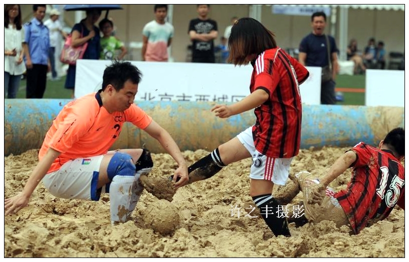 2014年6月29日下午,为期9天的2014泥浆足球世界杯中国赛北京站”在月坛体育场圆满落幕,共有48支参赛队伍,共开展47场泥浆赛场争夺北京站冠军。对阵双方均由男女队员组成,踏进40厘米厚的泥浆场后,队员们一边使劲摆脱泥沼,一边运球、传球、射门,足球与泥浆齐飞,不一会儿球衣都被染成了泥色,场面好不热闹,不仅体格得到锻炼,更重要得到快乐。此次比赛得到了众多白领、群众的喜爱和热情参与。在决赛中,中国银监会队与肖邦进行曲队的冠军争夺战一度白热化,双方球门久攻不破,在常规赛与加时赛之后仍是0比0。比赛进入了点球大战,最终中国银监会队凭借守门员挡住对方最后一粒点球,成功获得本届赛事冠军。这也标志着2014泥浆足球世界杯中国赛北京站完美谢幕。图为在泥浆足球的比赛中。工人日报-中工网记者许之丰摄影报道