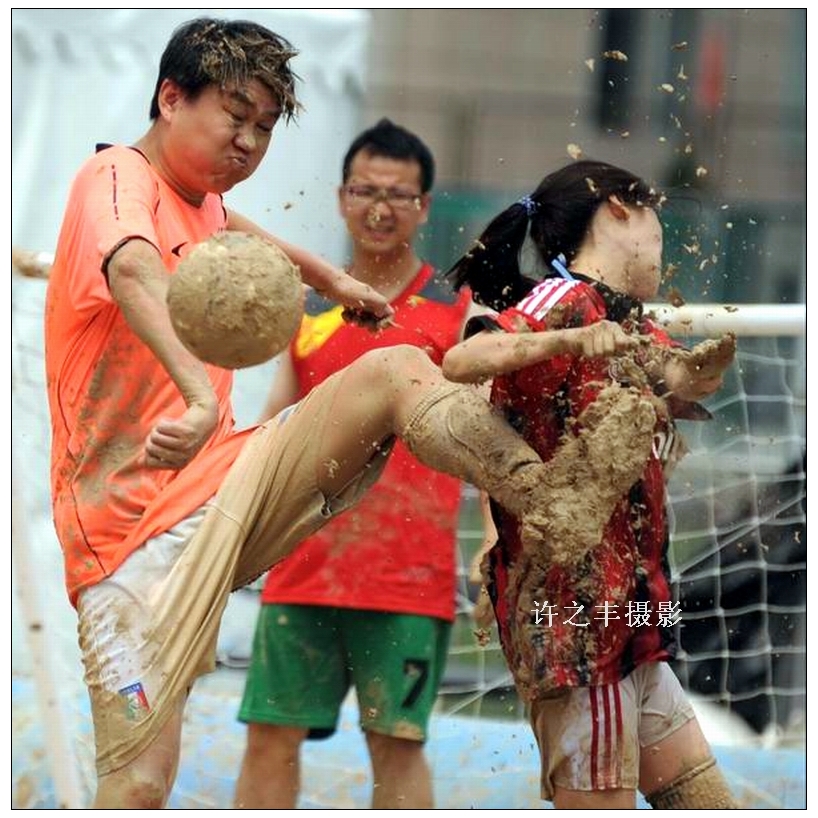 2014年6月29日下午,为期9天的2014泥浆足球世界杯中国赛北京站”在月坛体育场圆满落幕,共有48支参赛队伍,共开展47场泥浆赛场争夺北京站冠军。对阵双方均由男女队员组成,踏进40厘米厚的泥浆场后,队员们一边使劲摆脱泥沼,一边运球、传球、射门,足球与泥浆齐飞,不一会儿球衣都被染成了泥色,场面好不热闹,不仅体格得到锻炼,更重要得到快乐。此次比赛得到了众多白领、群众的喜爱和热情参与。在决赛中,中国银监会队与肖邦进行曲队的冠军争夺战一度白热化,双方球门久攻不破,在常规赛与加时赛之后仍是0比0。比赛进入了点球大战,最终中国银监会队凭借守门员挡住对方最后一粒点球,成功获得本届赛事冠军。这也标志着2014泥浆足球世界杯中国赛北京站完美谢幕。图为在泥浆足球的比赛中。工人日报-中工网记者许之丰摄影报道