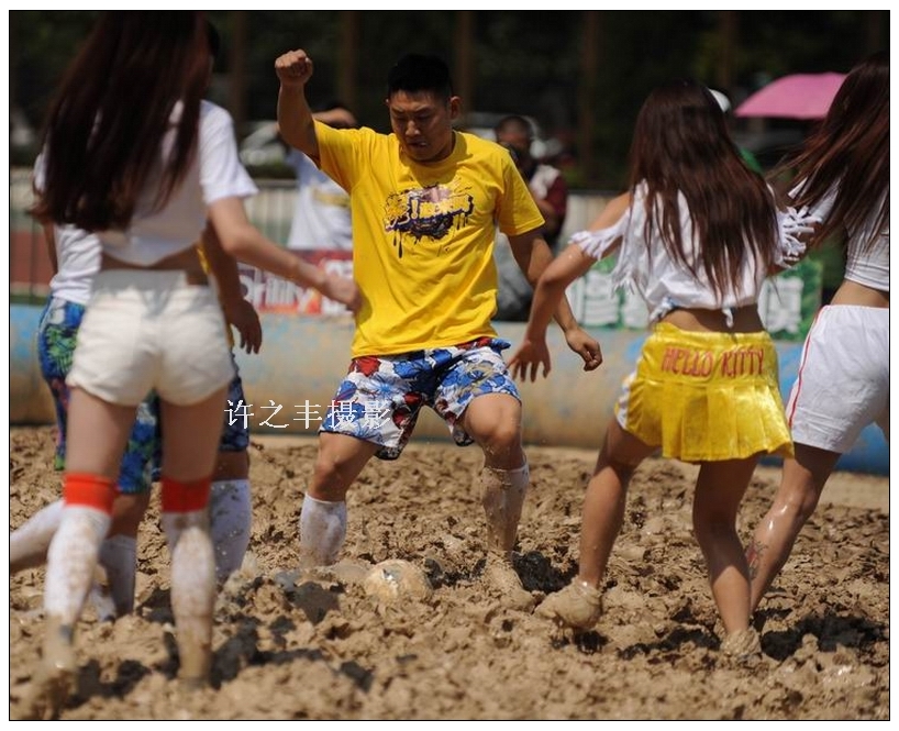 2014年6月23日,“2014泥浆足球世界杯中国赛”在北京月坛体育场迎来了美女足球宝贝和国安球星队的精彩表演赛。电影《足球宝贝》的主创团队与原国安球星李红军、隋东亮、南方、姜滨等人共同呈现了一场精彩的泥浆足球对抗赛。球员们一边使劲摆脱泥沼,一边运球、传球、射门,足球与泥浆齐飞,不仅体格得到锻炼,更重要得到快乐。工人日报记者-中工网记者许之丰摄影报道