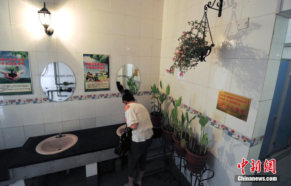 7月1日,河北石家庄马路旁的一个公共厕所内,花香弥漫,舒缓的轻音乐让每一位上厕所的市民心情舒畅、流连忘返;其温馨、整洁的环境可与酒店星级卫生间媲美。图为厕所浪漫一角。中新社发 翟羽佳 摄