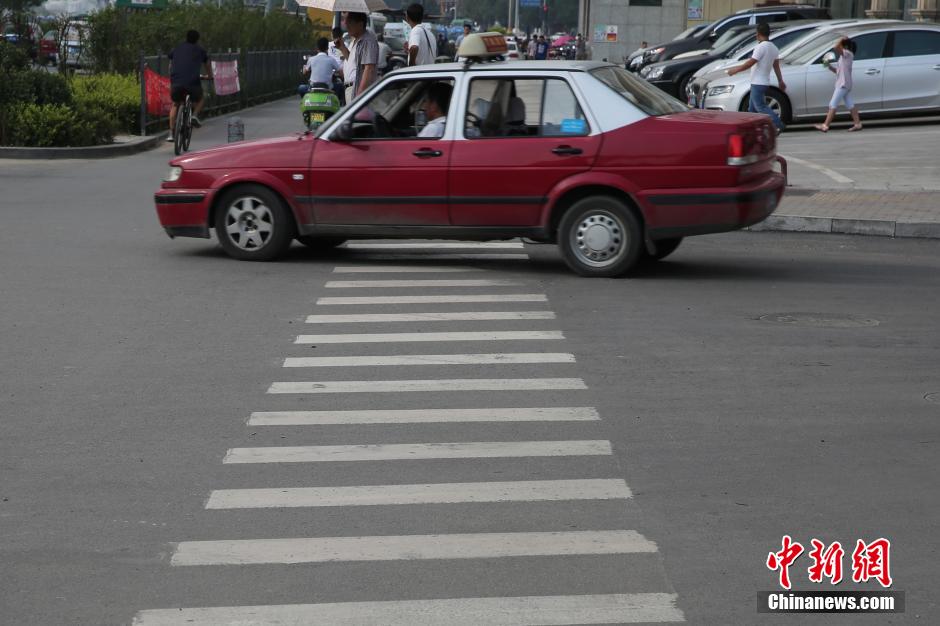 7月2日,山西太原并州路桥东街口,一条只有1.5米宽的斑马线仅能容纳两人并排行走。根据中国《公路交通标志和标线设置规范》,人行横道线的最小宽度应为300厘米,该路口的人行横道线仅为最低标准的一半。中新社发 武俊杰 摄