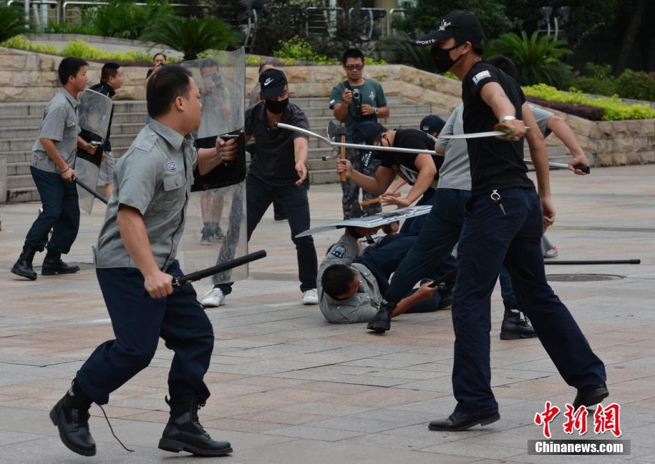 7月3日,广西柳州市警方在闹市区开展反恐应急演练。模拟5名“暴恐分子”在该市人民广场内对过往行人进行砍杀,保安立即用盾牌、防暴叉等工具进行自我防御。接到报警后,该市城中警方迅速出动警力,3分钟内赶到现场。武装民警在面对携刀拒捕的5名“暴徒”警告无效后,鸣枪示警,随后果断将暴徒击伤制服,并协助随后赶来的医务人员进行现场救治工作。本次演练共出动警力160余人次、警车20台次。陈方 摄