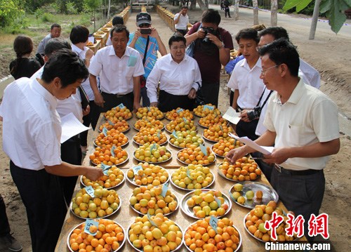 有“中国最大杏园”之称的新疆英吉沙县3日举办2014年赛杏会,153名农户参选“杏王”,参赛的杏子大如鸡蛋。据悉,“杏王”评选从色泽、口感、长度三方面进行,通过奖励优胜者激发农民种植杏子的积极性,促农增收。目前,英吉沙县杏树种植面积达30余万亩,年产鲜杏22万吨,成为当地农民增收的重要来源。中新社发 戚亚平 摄
