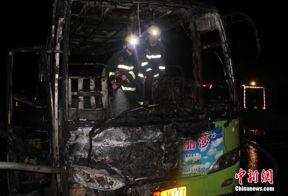 7月5日,消防官兵正在扑灭客车大火。当日晚21时左右,四川成都成简快速通道二号隧道口处,一辆行驶中的客车突然起火燃烧,因疏散及时车上36名乘客无人员伤亡。据悉,车上全部是放假准备返家的学生。目前,客车所属公司已调集车辆转运学生前往成都,客车起火的具体原因当地有关部门正在调查中。中新社发 钟欣 摄