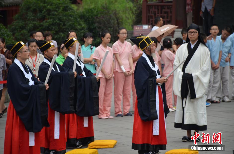 7月6日,都江堰文庙暨国学基地2014年暑期国学夏令营第一期正式开营。都江堰文庙在大成殿专门举办了一场的原汁原味的古代书院、学宫“开学典礼”——“释菜礼”祭孔仪式,用以传承古代书院教育传统。释菜礼由年近八十高龄的都江堰国学会会长、川西著名建筑设计师李玉堂先生亲自主祭,都江堰国学院夏令营近百名师生身着汉服参与祭孔。这是古代书院、学宫释菜礼仪式首次在西南地区完整呈现。整个礼仪仪程按照光绪年间《增修灌县志》编排,仪式庄重典雅,充满着祭祀的神圣感。当天,都江堰国学院还正式面向海内外学子发布了招生章程。中新社发 都文 摄