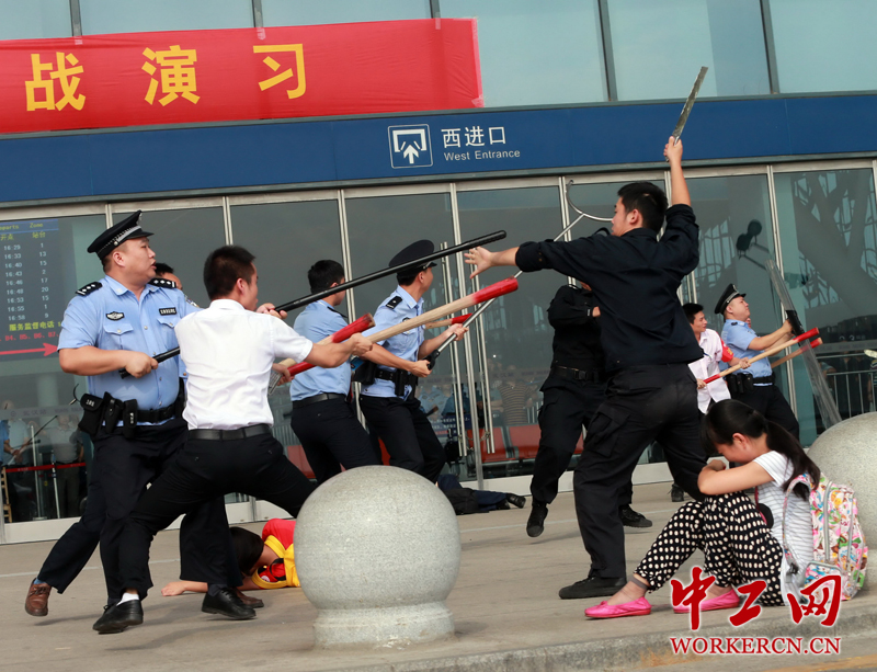 7月3日,武汉火车站西车行平台,“高铁2014”反恐综合实战演练,铁路民警与应急小分队队员合围“暴恐分子”(赵军摄)