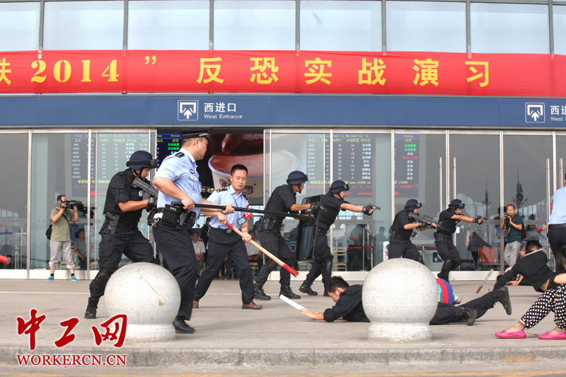 7月3日,武汉火车站西车行平台,“高铁2014”反恐综合实战演练,铁路特警第一时间赶到现场将“暴恐分子”制服(牛振江摄)