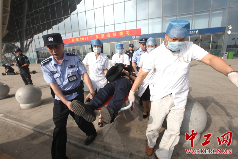 7月3日,武汉火车站西车行平台,“高铁2014”反恐综合实战演练,武铁民警和医护人员救治受伤群众(牛振江摄)