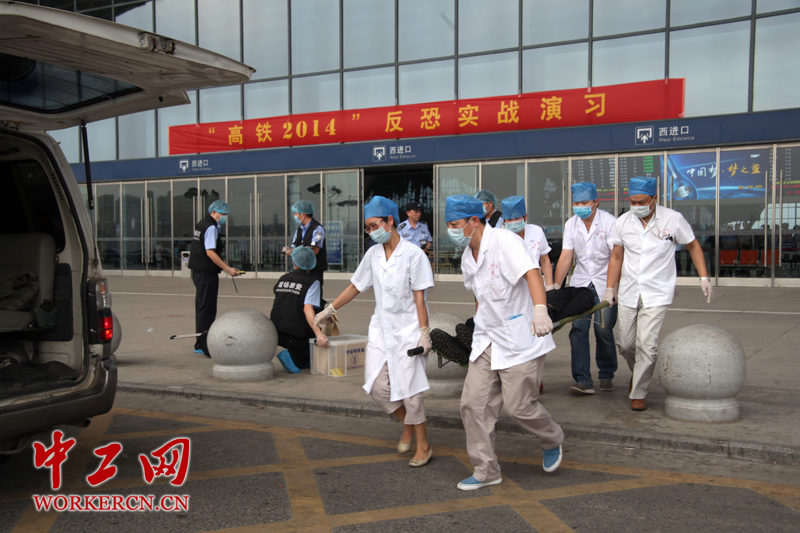7月3日,武汉火车站西车行平台,“高铁2014”反恐综合实战演练,医护人员将被“击毙”的“暴恐分子”抬离现场(牛振江摄)