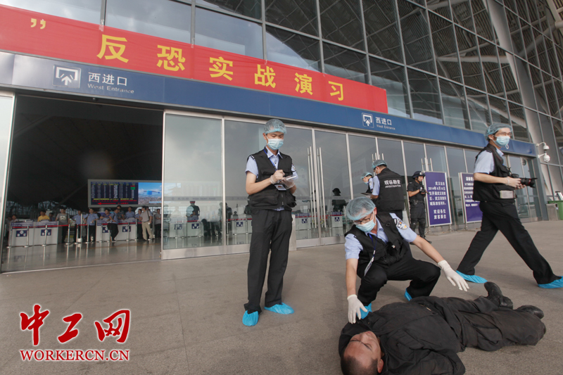 7月3日,武汉火车站西车行平台,“高铁2014”反恐综合实战演练,铁路警方刑事技术民警进行现场勘查(牛振江摄)