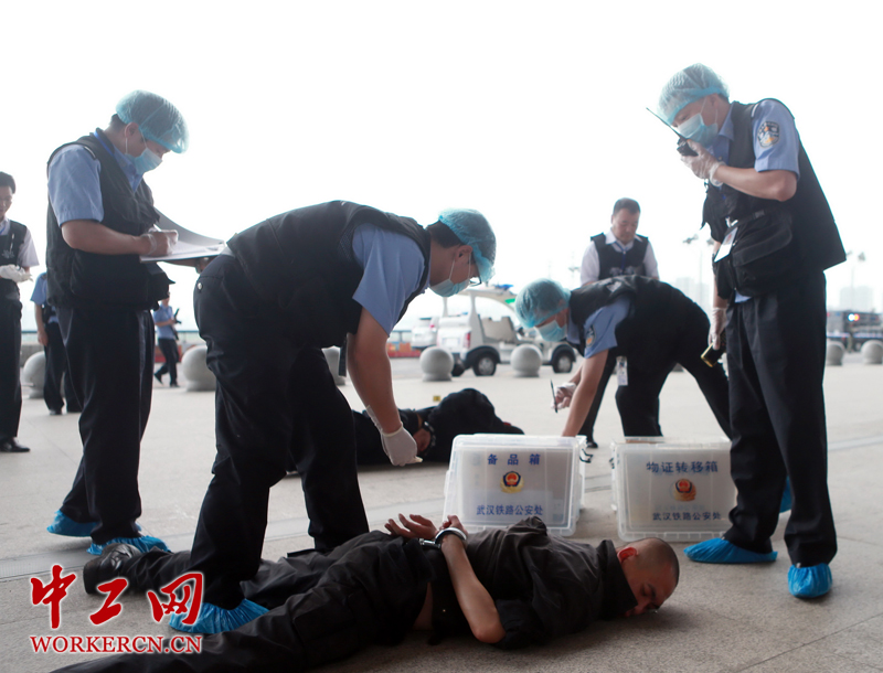 7月3日,武汉火车站西车行平台,“高铁2014”反恐综合实战演练,铁路警方刑事技术民警进行现场勘查(赵军摄)