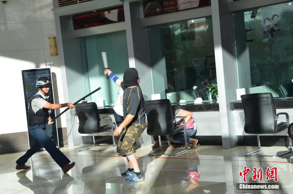 暴徒持刀大厅内砍杀、“运钞车”伺机接款这种电影中经常出现的画面9日晚间在云南红河某银行网点内真实上演,但这并不是一起犯罪案件,而是该银行为了防范于未然进行的反恐演练。特警将“运钞人员”制服。中新社发 丁艳 摄
