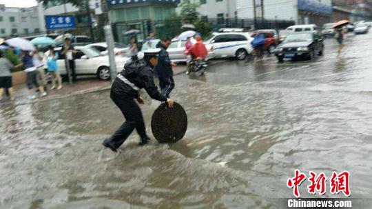山西太原市区一路段积水严重,民众无法通行,民警现场处理。刘小红 摄