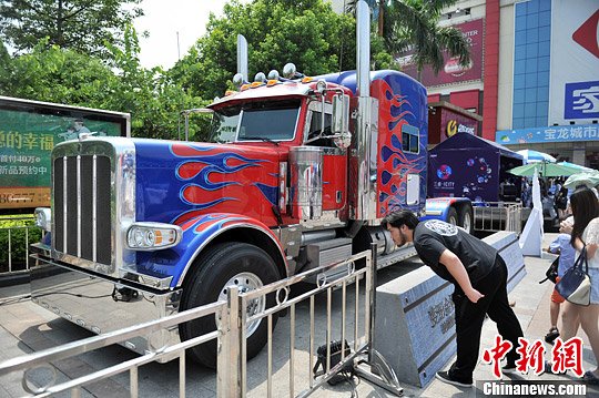 7月9日,9米长“擎天柱”亮相福州,吸引影迷。当日,《变形金刚4》电影道具中国巡展福州站正式开展。中新社发 吕明 摄