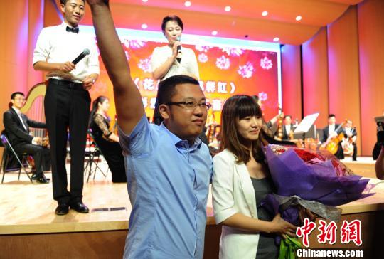 7月9日晚间,在长影音乐厅举行的一场音乐会临近尾声时,出现戏剧性的一幕。一位男青年突然走上舞台,当着全场观众的面,向相爱多年的女友求婚,这突如其来的幸福令女孩喜极而泣。据这位名叫孙鹏的男青年讲,这场求婚仪式是他和亲友共同“密谋”的。最终在亲朋好友及现场观众的祝福声中,热泪盈眶的女孩接受了男友的求婚。 张瑶 摄