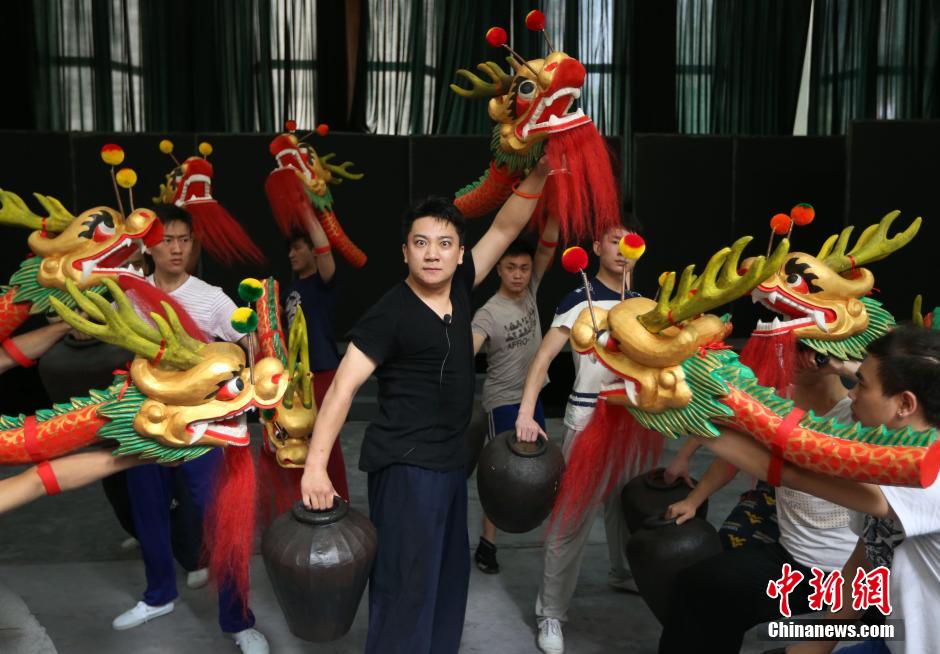 7月10日,江苏省京剧院的演员们正在表演澳门醉龙舞,进行京剧《镜海魂》的排练。当日,由澳门本土作家穆欣欣创作、江苏省演艺集团京剧院和澳门基金会共同打造的史诗京剧《镜海魂》在南京举行新闻发布会,宣布该部京剧将于7月29日在南京紫金大戏院首演,明年1月14日在澳门上演。据了解,《镜海魂》通过唱念做舞将澳门165年前一段难忘的本土故事搬上京剧舞台,展开一幅历史沧桑的画卷。同时采用大家耳熟能详的《七子之歌》作为主题歌,并将独一无二的澳门“醉龙舞”作为一大亮点贯穿该剧始终。中新社发 泱波 摄