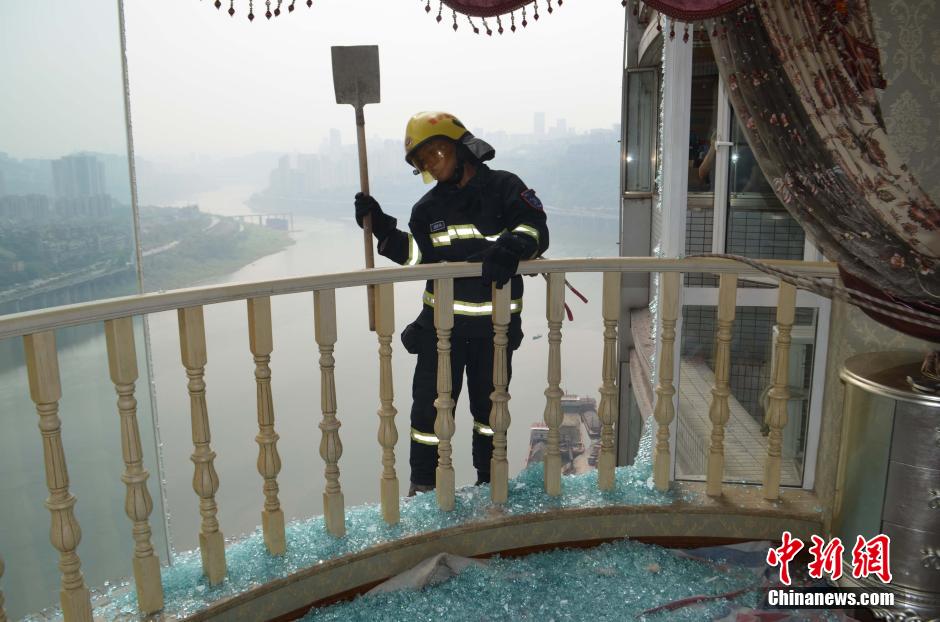 7月10日,重庆持续高温,当地沙坪坝区金沙港湾一29楼居民家的落地窗玻璃遭晒爆,玻璃中间炸开一个大洞,破碎的玻璃随时有可能坠落砸向室外行人和车辆。8名消防官兵抵达现场“高空取物”,才终于排除险情。佘樊露 摄