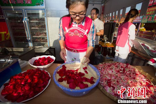7月10日,由各类鲜花制成的鲜花宴在太原美食节一登场就引起市民的关注。中新社发 张云 摄