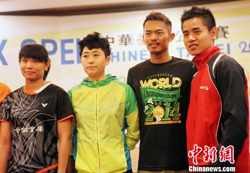 7月14日,大陆名将林丹(右2)、于洋(左2)和台湾选手戴资颖(左1)在台北出席“2014中华台北羽球公开赛”赛前记者会。中新社发 黄少华 摄