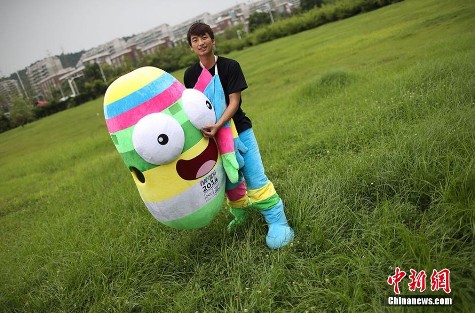 在即将于8月16日开幕的2014青年奥林匹克运动会的舞台上,除了参赛的各国青少年运动员、洋溢着青春的志愿者,还有一群活跃于各个比赛场内外、调动现场气氛的青奥吉祥物砳砳。7月15日,砳砳的扮演者、来自南京航空航天学院民航(飞行)学院的70名飞行学员开始了集训,他们不仅要进行系统的舞蹈和体能训练,也需要学会“卖萌”、“调皮”、“指挥”……。尽管天气很热,还要头戴毛绒材质的砳砳服装,挥汗如雨的钻进钻出,需要的不仅仅是体力,更加需要的是一份内心对青奥会的热情和志愿者应该具备的执着。据了解,青奥会期间,该校除了70位砳砳外,还有356名语言类志愿者、1110名通用类志愿者活跃在赛场内外。图为扛着砳砳的志愿者拍摄完创意照片后从草坪上离开。泱波 摄