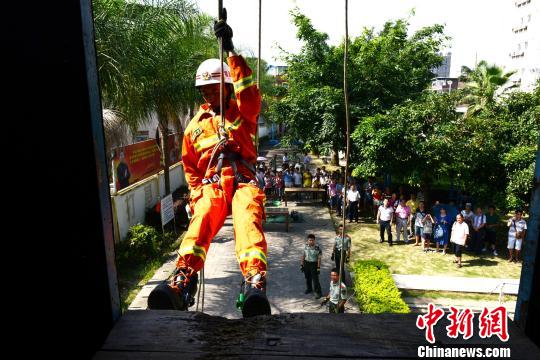 7月15日,来自福建龙岩的60余名媒体记者走进“红门”,“零距离”体验消防,通过一系列富有趣味的消防比赛,了解消防器材的使用方法,学习消防知识。周杨东 摄