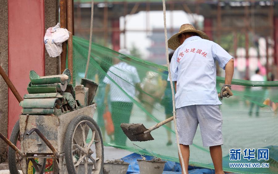 近日,沈阳故宫两大标志性建筑——文德坊、武功坊周围都架起了脚手架,坊顶有工人将琉璃瓦一层层掀起。据了解,这是距今已有377年历史的文德坊、武功坊将要进行加强防水功能的维修。图为7月15日,工人在沈阳故宫武功坊下施工。新华社记者 姚剑锋 摄
