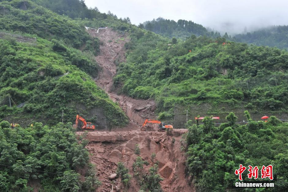 成都铁路局16日通报最新消息称,目前川黔铁路泥石流水害现场抢险清挖工作仍在紧张进行,截至下午14时,现场共投入1200余名抢险人员、近30台抢险机械,已累计清除淤积物12000余立方米,部分抢险人员已投入到对溜坍山体坡面的危树、杂石的清理中,确保坡面排水,保证抢险进度。图为川黔铁路抢险。王正伟 摄