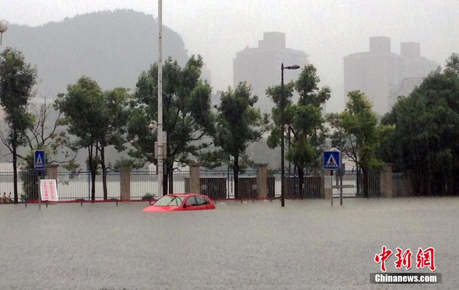 7月16日,贵阳气象台发布暴雨红色预警,持续的暴雨让城市多数路段积水成河,部分道路交通中断,多个地域出现内涝,市民出行受阻。贵阳市在去过24小时的降雨量居全省之首。图为车辆被淹。中新社发 严光辉 摄
