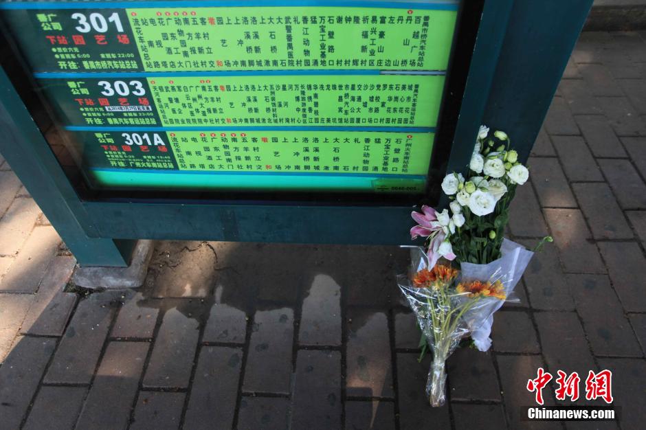 广州警方7月16日下午对外通报称,15日晚发生在广州海珠区的公交车纵火案件告破,16日上午11时47分抓获犯罪嫌疑人欧某生(男,25岁,湖南省衡南县人)。欧某生亦供述纵火事实。图为在案发地墩和公交车站,市民献花向遇难者表示哀悼。中新社发 柯小军 摄