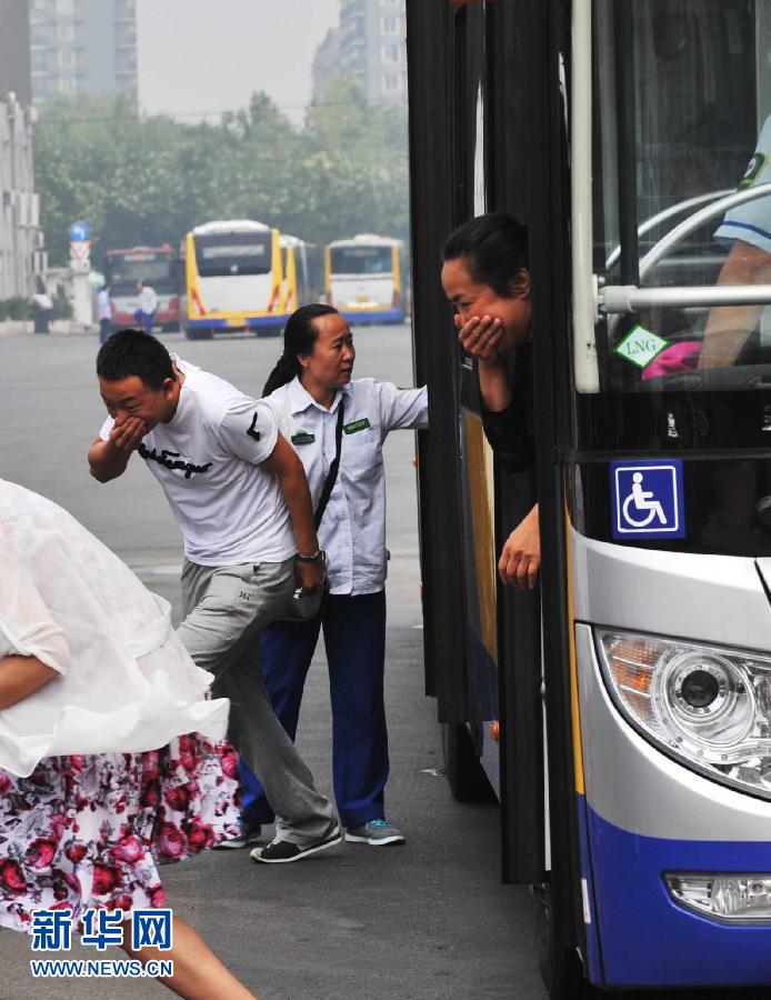 7月16日,乘客从一辆“着火”的公交车上疏散。当日,北京市公安局联合公交集团开展公交车反恐防暴演练,公安局民警、公交集团工作人员共50余人参加了演练。 新华社记者 李文 摄
