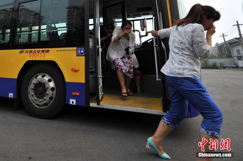 7月16日下午,北京市公安局针对目前复杂的反恐形势,在北京公交总队718路公交车总站举行“反恐演习”,内容包括:针对公共汽车实施的突发性暴力事件和公交车突然失火、冒烟等突发情况。当日,“嫌疑人”短衣男子借泼汽油将公交劫持,随后在司乘人员与乘客的配合下迅速被制服。图为乘客“紧急疏散”。中新网记者 金硕 摄