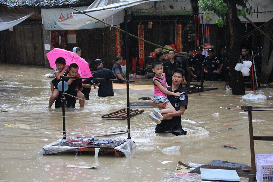 7月13日20时至16日8时,贵州省出现持续大范围强降雨天气,铜仁、毕节、遵义等地遭受不同程度洪涝灾害。其中铜仁市共86乡镇出现特大暴雨,最大雨量为铜仁市松桃苗族自治县寨英镇453毫米。新华社发(唐义长摄)