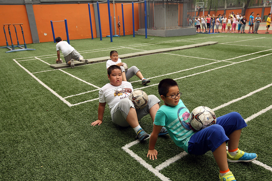 7月16日,由北京东城区教委举办的第二届小学生“小壮壮”暑期训练营进入第三天,来自东城区40多所学校的近150名学生在北京177中训练营地进行了体能训练。训练营的学员均为体重超标的小学生,他们将在为期一周的训练中参加趣味游戏、球类项目培训、健康知识大讲堂等活动。新华社发(周良摄)