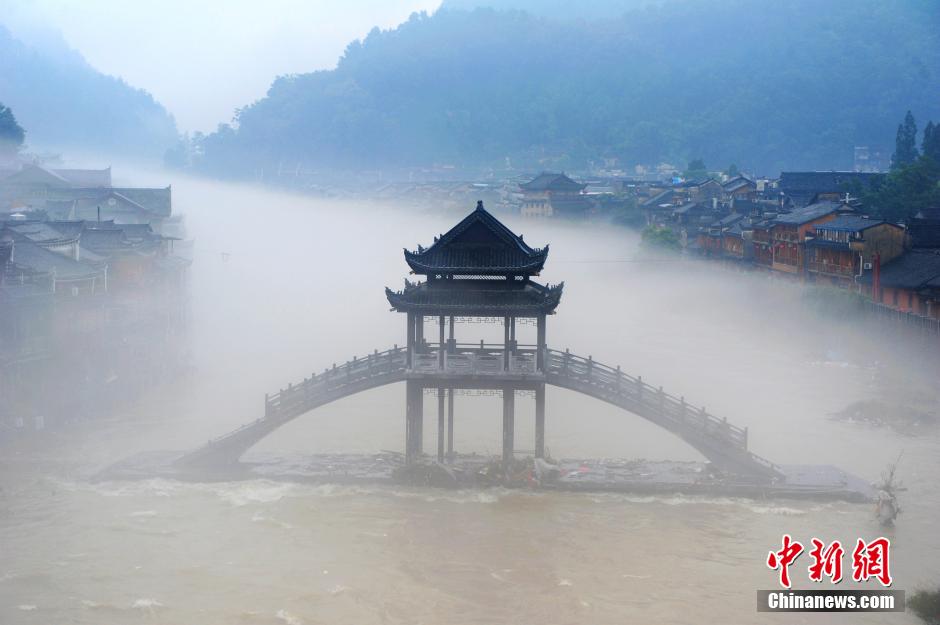 7月17日傍晚,洪水退去的湖南凤凰古城沱江河面出现了云雾美景,犹如“仙境”,吸引了众多游客与居民前来合影留念。 中新社记者 杨华峰 摄